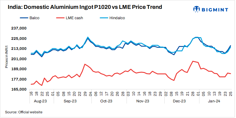 India’s primary aluminium producers have increased ingot (P1020, 99.7%) prices by INR 5,750/t ($69/t). Post-revision, Balco’s prices stood at INR 216,700/t ($2,606/t). Meanwhile, Hindalco’s prices were at INR 215,000/t ($2,586/t). All prices are ex-works and exclude GST.