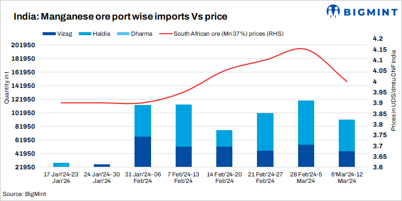Imported cargo arrivals down by 23% w-o-w: Imported manganese ore cargo arrival has dropped by 23% forbMn37%, Mn44%, and Mn46% weekly, reaching 92,350 t between 6-12 March 2024, compared to the previous week’s 119,815 t. The weekly import volume of manganese ore has been primarily influenced by concern over demand for manganese alloys.