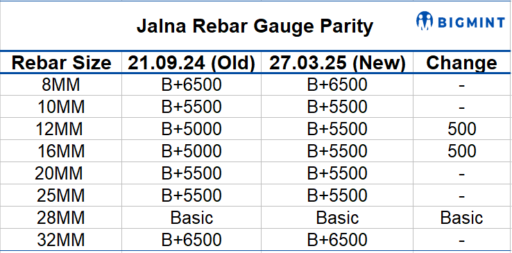 IF-route rebar manufacturers in Jalna, Maharashtra, have revised the gauge parity in certain sizes, effective 27 Mar’25. Rebar gauge differences in the 12 and 16 mm sizes have increased by INR 500/t to INR 5,500/t, while parity for the remaining sizes is the same. Notably, Jalna is the major rebar manufacturing hub in western India, with a daily production capacity of over 10,000 t.