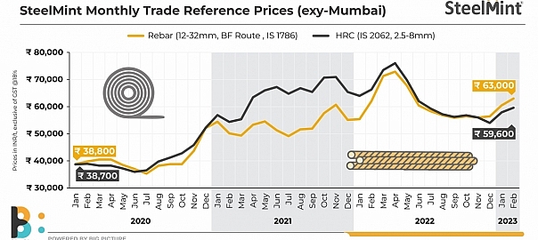 India: Rebar prices at all-time high premium to HRCs in Feb'23