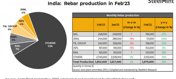 India’s rebar production stood at 3.8 mnt in Feb’23, up 4% from 3.65 mnt in Jan’23, according to Joint Plant Committee’s (JPC’s) data. On y-o-y basis, output rose by 32% compared to 2.87 mnt in Feb’22. Production of state owned companies – SAIL and RINL – remained stable m-o-m while that of JSW Steel, JSPL and Tata Steel saw a fall of 15%, 13% and 6% respectively in Feb’23.