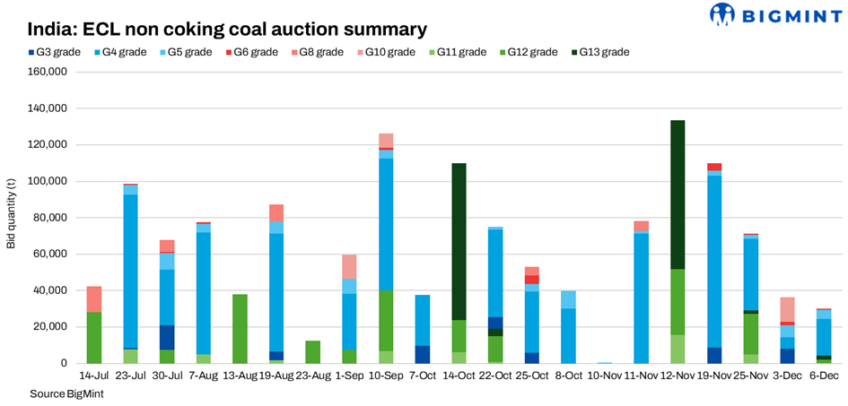 G5 grade (5,800-6,100 GCV) of around 5,100 t was sold at INR 4,090/t, stable compared with INR 4,087/t on 3 December, indicating steady mid-CV demand.