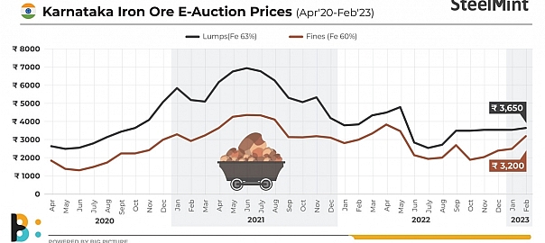 - SMIORE-Karnataka had conducted 1,000 t of iron ore fines (Fe57.2%) auction on 21 Mar’23. The auction failed to attract buyers. The floor price was INR 3,550/t.