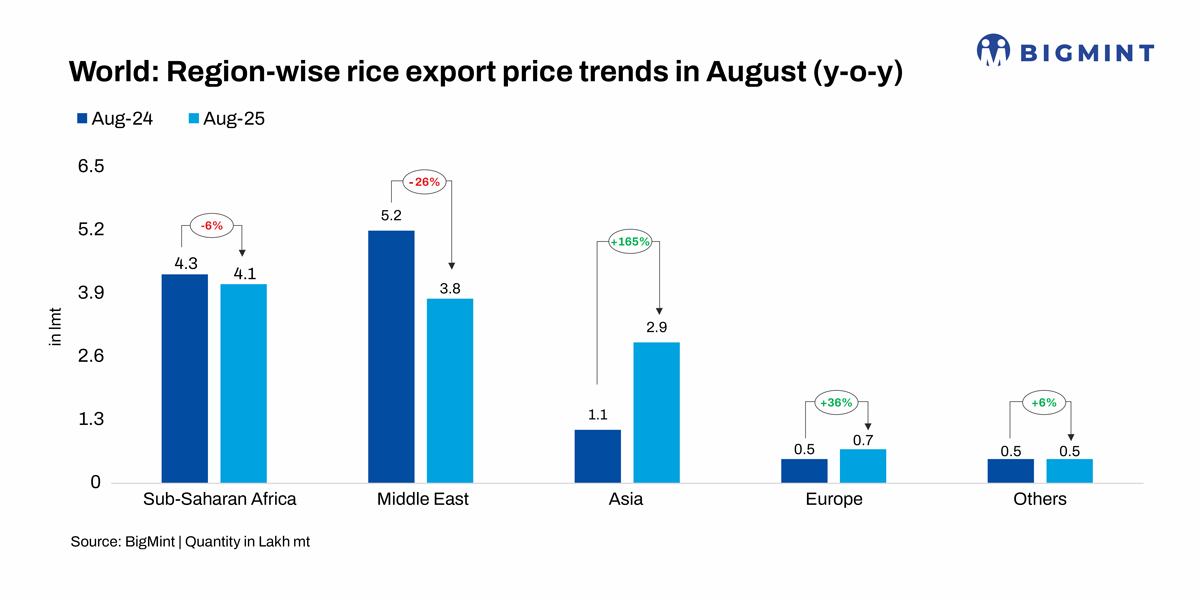 The most notable growth was in Asia, where exports surged by an astonishing 165%. The volume jumped from 1.1 lakh MT in August 2024 to 2.9 lakh MT in August 2025, making Asia a key growth driver for India’s rice trade. Following this, Europe also showed robust growth of 36% y-o-y from 0.5 lakh MT to 0.7 lakh MT. The “Others” category, representing smaller markets, saw a modest 6% y-o-y increase from 0.5 lakh MT to 0.53 lakh MT (the chart rounds this to 0.5).