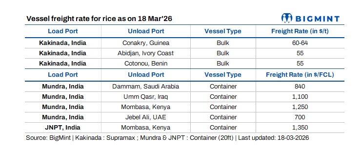 India’s rice export freight market remained volatile as of 18 March 2026, with bulk freight on West Africa routes largely steady while containerised shipments from west coast ports continued to face disruptions amid geopolitical tensions, rising bunker prices and cautious market sentiment.
