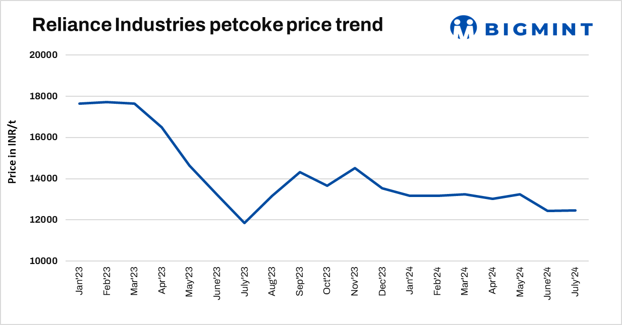 Reliance Industries Ltd (RIL) has marginally raised pet coke prices to INR 12,473/t ($150), up by INR 34/t ($0.5) m-o-m for July sales. Stability in imported pet coke prices have supported domestic prices. The current month’s price is higher by same month of the last year’s price by around 2%.