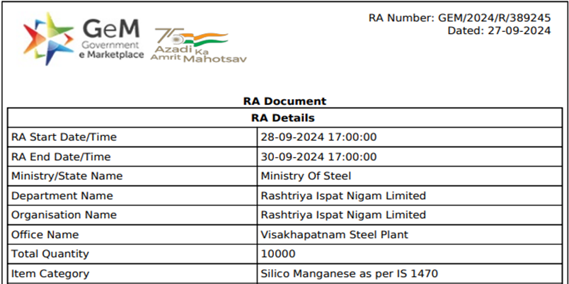 Rashtriya Ispat Nigam Ltd (RINL) conducted a reverse auction for 10,000 t of silico manganese (60-15, 10-100 mm) on 30 Sep’24. The L1 bid price was INR 90,800/t FOR, including GST and GEM portal charges, sources informed. BigMint assessed silico manganese (60-14, 25-150 mm) prices at INR 67,300/t exw-Vizag on 30 Sep’24.