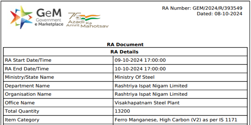 India: RINL books 13,200 t of ferro manganese at reverse auction