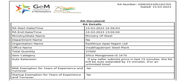 State-run RINL had conducted a reverse auction for 37,000 t (40-100mm) of silico manganese (60-15 grade) on 15 Mar’23. The entire material was booked at INR 87,800/t FOR (including GST and GEM portal charges). Excluding GST and GEM portal charges, prices are at around INR 73,600/t FOR. SteelMint’s assessment of, silico manganese (60-14) prices stood at INR 74,000/t exw-Visakhapatnam on 15 March.