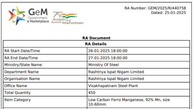 State-run Rashtriya Ispat Nigam Ltd (RINL) has concluded a reverse auction for 450 t of low-carbon (LC) ferro manganese (Mn: 92% min, C: 0.15% max, size: 10-60 mm) on 27 Jan’25. The L1 price was at around INR 206,400/t on an LCNC basis, sources informed.