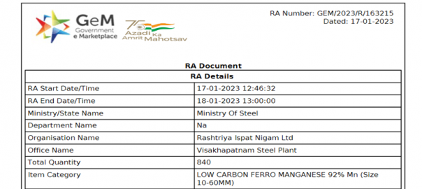 State-run Rashtriya Ispat Nigam Ltd (RINL) has concluded a reverse auction for 840 t of low carbon (LC) ferro manganese (grade:92%min and size: 10-60 mm) on 17 Jan’23. The entire material was booked at around INR 227,000/t FOR, including GST and GEM portal charges, sources informed.