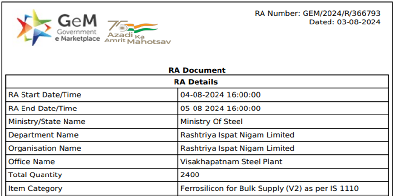 Rashtriya Ispat Nigam Ltd (RINL) conducted a reverse auction for 2,400 t of ferro silicon (Si:70% min, 40-100 mm) on 5 Aug’24 for its Visakhapatnam Steel Plant. The L1 bid price was INR 117,500/t FOR including GST and GEM portal charges, sources informed.