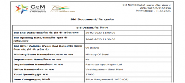 Rashtriya Ispat Nigam Ltd (RINL), the corporate entity of Vizag Steel Plant, has invited bids to procure 37,000 t of silico manganese (grade: 60-15 and size: 25-100 mm). The last date of bid submission is 20 Feb’23. SteelMint’s assessment of silico manganese prices stood at INR 77,000/t exw-Vizag on 10 Feb’23.