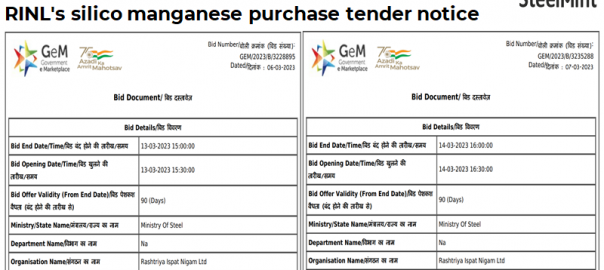 State-run RINL-Visakhapatnam Steel Plant has floated two high carbon silico manganese purchase tenders – one for 3,070 t (60-15 grade; 40-100 mm size) and another for 2,000 t (60-15 grade; 25-50 mm size). The last date of bid submission for these tenders is 13 Mar’23 and 14 Mar’23 respectively. Bids are valid for 90 days from the submission date. SteelMint assessed silico manganese prices at INR 74,000/t exw-Vizag on 10 Mar’23.