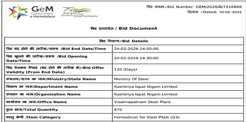 Rashtriya Ispat Nigam Ltd (RINL) has issued a purchase tender to procure 670 t of ferro silicon (Si 70% min, 25-50 mm) for its Visakhapatnam Steel Plant. The bid submission deadline is 24 Feb’26. Delivery is scheduled within 120 days from the date of the purchase order. BigMint assessed ferro silicon prices (Si 70%, 25-150 mm) at INR 95,000/t ($1,049/t) ex-Guwahati on 9 Feb’26.