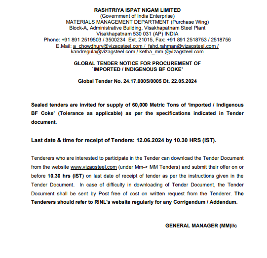 RINL invited bids to procure 60,000t of imported/indigenous BF coke (CSR 64-65%, Moisture 5%, Ash 12.5%). The last bid submission date is 12 Jun’24, 10:30 IST. RINL seeks to procuree from a single source. For indigenous supplies, tenderers must quote a minimum of 30,000 t, with additional quantities in multiples of 2,500t (approximate quantity/rake). For imported supplies, tenderers must quote a minimum of 30,000(+/-10%).