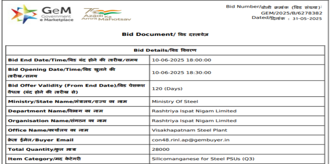 Rashtriya Ispat Nigam Ltd (RINL) has invited bids for the procurement of 28,000 t of silico manganese (60-15, 10-100 mm) for its Visakhapatnam Steel Plant. The last date for submission of bids has been extended till 27 Jun’25, and the bid offer is valid for 120 days from the deadline. BigMint assessed silico manganese (60-14, 25-150 mm) prices at INR 71,200/t exw-Vizag on 24 Jun’25.