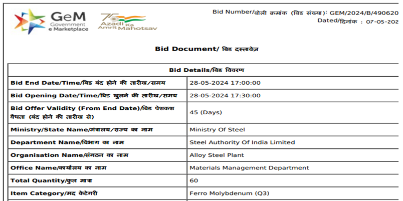 India: SAIL-ASP floats 60 t ferro molybdenum purchase tender