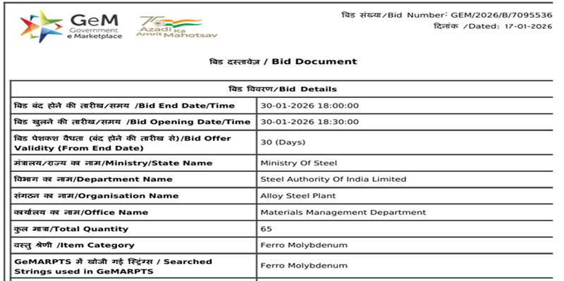 SAIL’s Alloy Steel Plant (ASP) has floated a purchase tender to procure 65 t of ferro molybdenum (Mo: 60% min, 10-50 mm). The last date for bid submission is 30 Jan’26, and delivery of material is scheduled within 150 days from the date of the purchase order. BigMint assessed ferro molybdenum (Mo: 60%, 10-100 mm) prices at INR 2,934,000/t ($32,265/t) ex-India on 16 Jan’26.