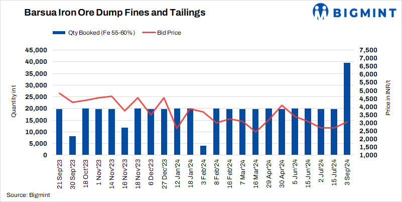 SAIL-Barsua auctioned 39,600 t of iron ore tailings on 3 Sep’24. Sources informed –