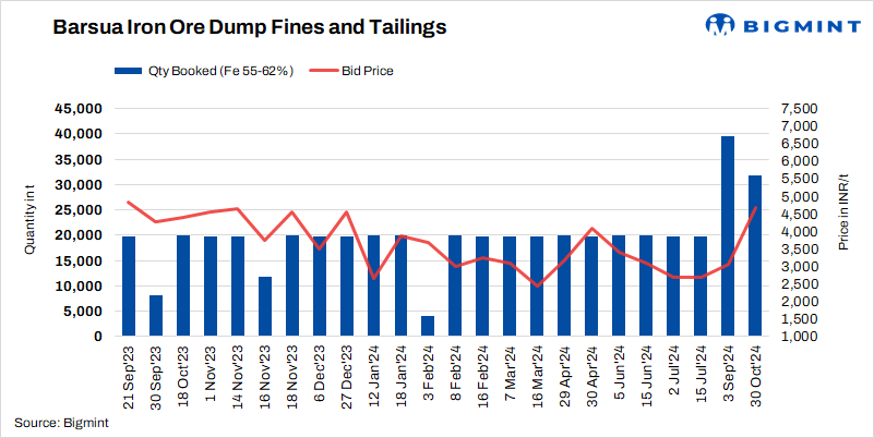 SAIL-Barsua conducted an auction for 31,740 t of iron ore tailings in two lots on 30 Oct’24. According to sources,