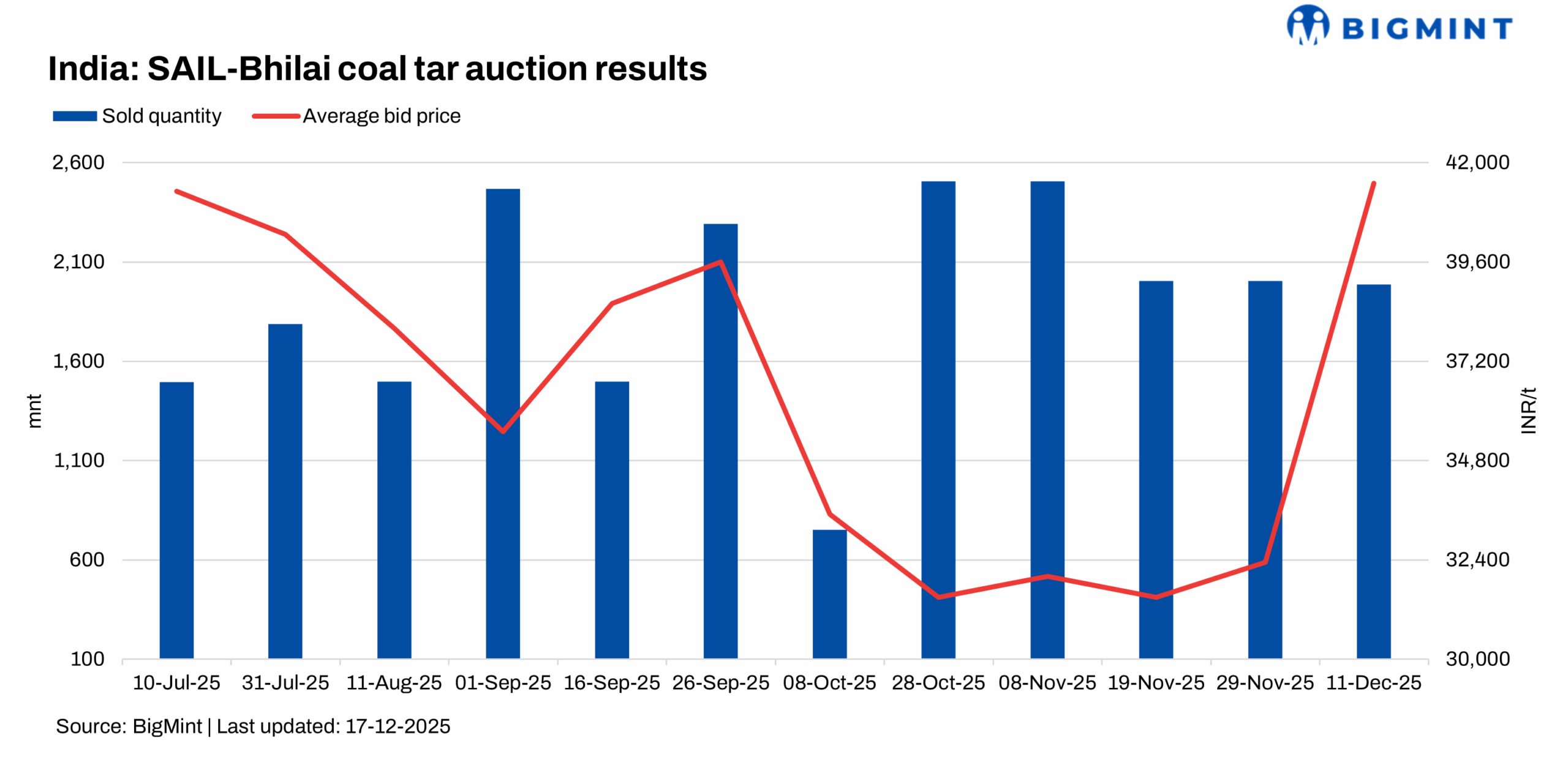 SAIL-Bhilai Steel Plant is set to auction 807 tonnes (t) of crude coal tar on 22 Dec’25. According to market sources, in the previous auction held on 11 Dec’25 the total quantity of 1,988 t was sold at a weighted average price of INR 41,000-42,000/t, an increase from the previous auction.