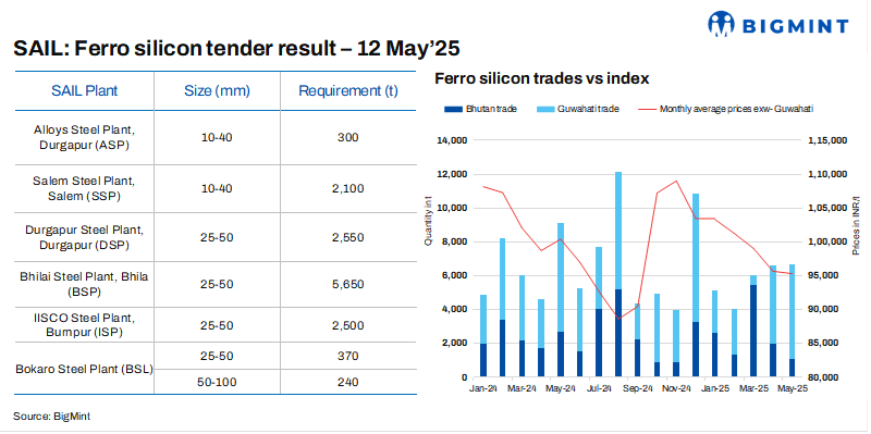 SAIL had earlier issued a purchase tender for 13,710 t of ferro silicon (Si: 70% min, 10-100 mm) for its six plants across India. At the reverse auction concluded today, the entire material was booked at INR 103,765/t FOR, excluding taxes, officials informed. Delivery of the material is scheduled within four months from the date of the purchase order.