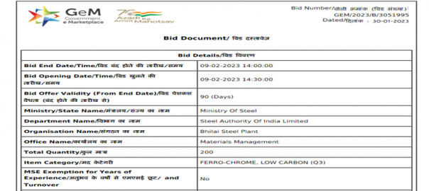 SAIL has floated a purchase tender for 200 t of low-carbon (HC) ferro chrome (Cr-60%, C-0.1% max, 10-30mm) for its Bhilai Steel Plant in Chhattisgarh. The due date for submission of bids is 9 Feb’23. The highest-priced bid elimination is applicable for the reverse auction qualification rule.