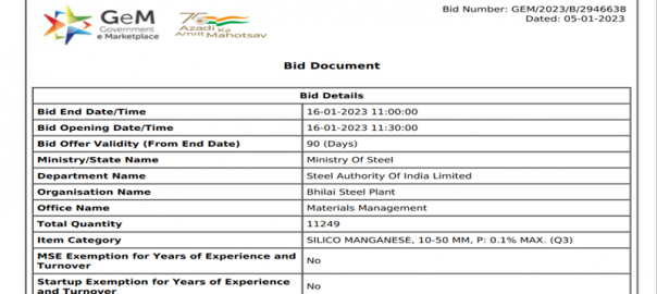 State-owned SAIL has invited a purchase tender for 11,249 t of silico manganese (60-15, size:10-50mm, P: 0.1% max) for its Bhilai Steel Plant, Chhattisgarh. The last date for bid submission is 16 Jan’23. SteelMint assessed silico manganese (60-14) prices at around INR 83,500/t exw-Raipur on 5 Jan’23.