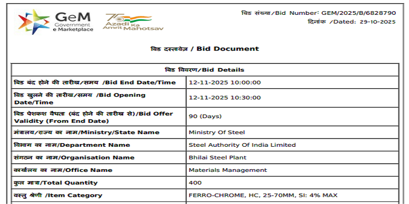 SAIL’s Bhilai Steel Plant (BSP) has invited bids to procure 400 t of high-carbon HC ferro chrome (Cr: 60-70%, C: 6-8%, 25-70 mm). The bid submission deadline is 12 Nov’25. As per the reverse auction qualification rule, the highest-priced bid will be eliminated. BigMint assessed ferro chrome (HC 60%, 10-150 mm) prices at INR 119,000/t ($1,341/t) exw-Jajpur on 31 Oct.
