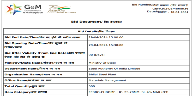 SAIL’s Bhilai Steel Plant (BSP) has floated a purchase tender for 500 t of high-carbon (HC) ferro chrome (Cr: 60%, C: 8% max, 25-70mm). The last date for submission of bids is 29 Apr’24 and the bid offer is valid for 90 days from the last date. BigMint assessed high-carbon ferro chrome (Cr: 60%, C: 8.5%, 10-150 mm) prices at INR 108,300/t exw Jajpur on 17 Apr.