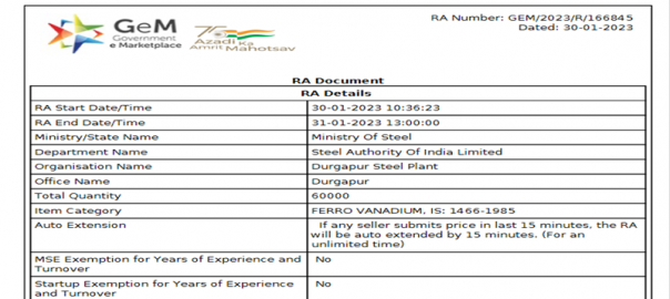 State-owned SAIL has concluded a reverse auction for 60 t of ferro vanadium (V: 50% Min, size:25-50mm) for its Durgapur Steel Plant (DSP), West Bengal, on 31 Jan’23. The material was booked at around INR 2,067,250/t FOR on 50% prorate basis, inclusive of GST and GEM portal charges.