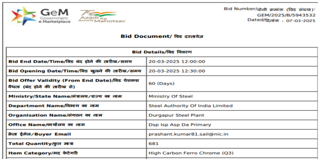 India’s largest steel producer, Steel Authority of India Ltd (SAIL), has scheduled an auction for 681 t (20-50 mm) of HC ferro chrome (60%) on 20 Mar’25 for its Durgapur Steel Plant (DSP). The bid offer is valid for 60 days from the date of the auction. BigMint’s assessment of ferro chrome prices stood at INR 101,600/t exw-Jajpur as of 7 Mar’25.