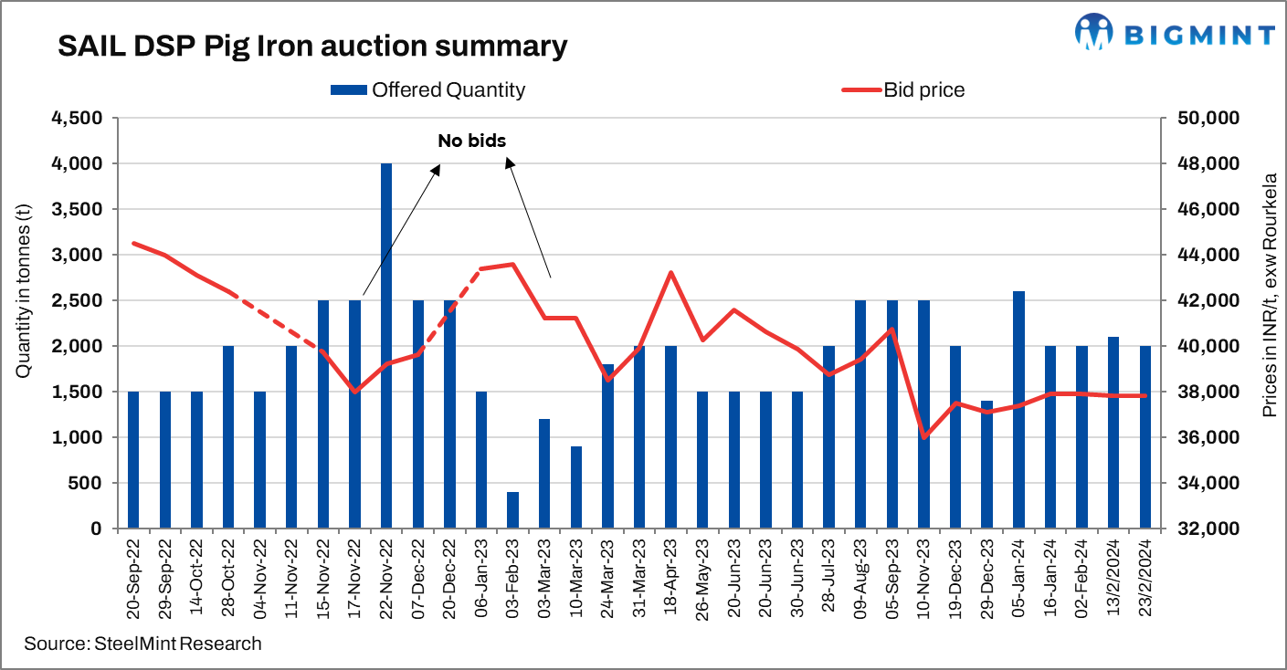SAIL’s Durgapur Steel Plant held an auction for 2,000 t of steel grade pig iron on 23 Feb’24. The total quantity was booked at an average price of INR 37,850/t exw. The last auction was conducted for 2,100 t of steel grade pig iron on 13 Feb, with the entire quantity getting booked at an average price of INR 37,850/t exw.