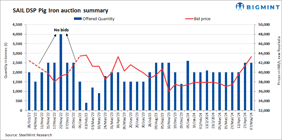 SAIL’s Durgapur Steel Plant (DSP) held an auction for 2,500 t of steel grade pig iron on 7 May’24. The total quantity was booked at an average price of INR 43,250/t exw. The last auction had been conducted for 2,500 t of steel grade pig iron on 26 Apr’24, with the entire quantity getting booked at an average price of INR 41,400/t exw.
