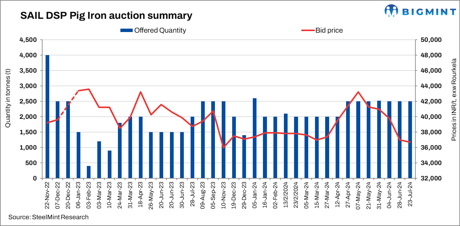 SAIL-Durgapur Steel Plant (DSP) held an auction for 2,500 t of steel grade pig iron on 23 Jul’24. Entire quantity was booked at an average price of INR 36,700/t exw. The last auction was conducted on 2,500 t of steel grade pig iron on 28 Jun’24 in which the entire quantity of 2,500 t were booked at an average price of INR 37,000/t exw.