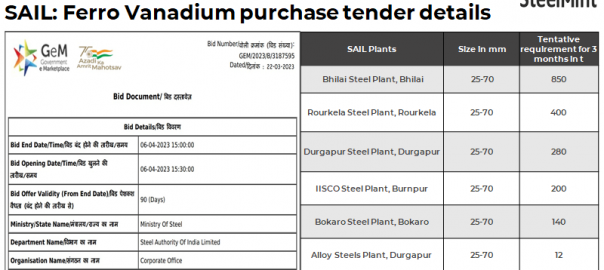 Steel major SAIL has invited bids for procurement of 1,882 t (low sulphur and low phosphorus, size: 25-70 mm) of ferro vanadium (50% min) for its six plants. The last date for bid submission is 6 Apr’23. Bids will be valid for 90 days from the order date.