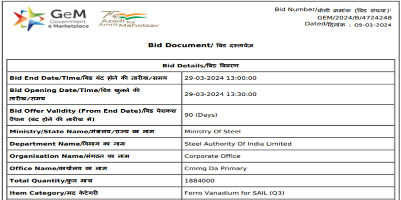 Steel major SAIL has invited bids for procurement of 1,884 t (V: 50% min, low sulphur and low phosphorus, size: 25-70 mm) of ferro vanadium for its five plants. The last date for bid submission is 29 Mar’24. Bids will be valid for 90 days from the order date.