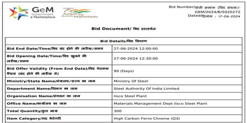 State-owned SAIL has invited a purchase tender for 300 t of ferro manganese (20-50 mm, Cr: 60 +/- 3) for its IISCO Steel Plant, Burnpur, West Bengal. The last date of bid submission is 27 Jun’24 and the bid is valid for 90 days from the end date. The highest-priced bid elimination is applicable for the reverse auction qualification rule.