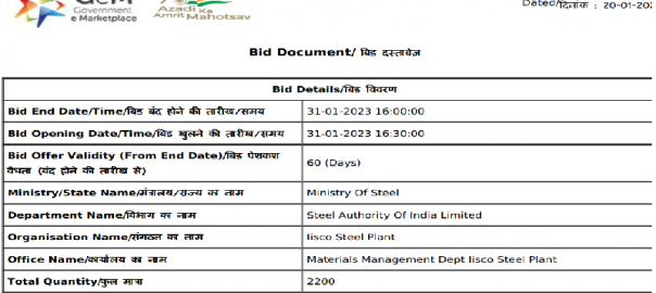 State-owned SAIL has invited a purchase tender for 2,200 t of high carbon ferro manganese (of grade Mn70%, size 25-50mm) for its IISCO Steel Plant (ISP), Burnpur, West Bengal. The last date for bid submission is 31 Jan’23. A reverse auction would be conducted amongst all the technically qualified bidders except the highest quoting bidder.