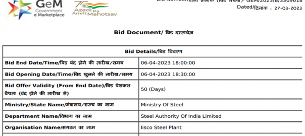 SAIL has floated a purchase tender for 9,000 t of high carbon (HC) silico manganese (Grade: 60-15, Size: 25-50mm) for its IISCO Steel Plant based in Burnpur, West Bengal. The last date for submission of bids is 6 Apr’23 and the bid offer is valid for 50 days from the end date. SteelMint’s assessment for silico manganese prices stood at INR 72,200/t exw-Durgapur as on 27 Mar’23.
