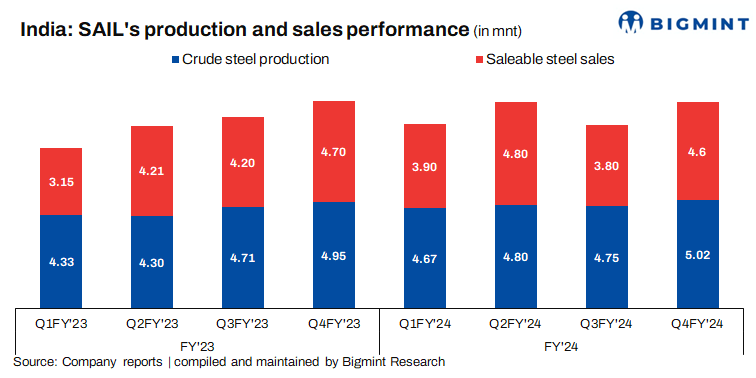 SAIL has posted 5% y-o-y growth in crude steel production at 19.24 mnt in FY’24 versus 18.29 mnt in FY’23. Production rose 6% q-o-q to 5.02 mnt in Q4FY’24 against 4.75 mnt in the last quarter. Sales volumes edged up by 5% y-o-y to 17.02 mnt in FY’24 compared with 16.20 mnt in FY’23. Q-o-q, sales increased by 20% to 4.56 mnt in Q4 as against 3.81 mnt in the preceding quarter.