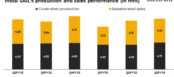 PSU steel major SAIL has posted its best ever quarterly crude steel production of 4.71 mnt in Q3FY23, up 4% against 4.53 mnt in CPLY. Output registered a 10% growth q-o-q compared to 4.3 mnt in the previous quarter. Sales volumes increased by 8% y-o-y to 4.15 mnt in Q3 compared with 3.84 mnt in Q3FY22. However, sales dropped marginally by 1% q-o-q against 4.21 mnt in Q2FY23.