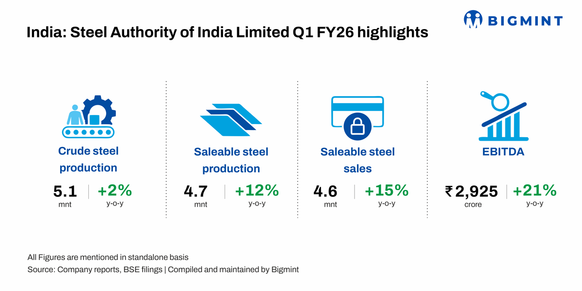 Net sales realisation (NSR) increases q-o-q: The net sales realisation (NSR) for flat products rose to INR 50,400/t in Q1FY’26, compared to INR 47,300/t in Q4FY’25. For long products, NSR climbed up to INR 54,500/t from INR 53,300/t sequentially. Preliminary July data indicates a seasonal dip, but management expects a recovery in pricing from September.