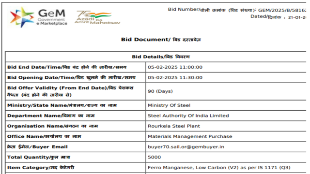 SAIL-Rourkela Steel Plant (RSP) has issued a purchase tender for 5,000 t of low-carbon ferro manganese (Mn: 78%, C: 0.5% max, size: 25-50 mm). The last date for bid submission is 5 Feb’25, and the bid offer is valid for 90 days from this date. The highest-priced bid will be eliminated as per the rules.