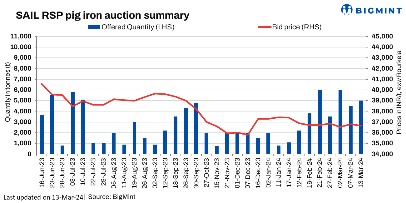 SAIL-Rourkela Steel Plant held an auction for 5,000 t of steel grade pig iron on 13 March’24. The entire quantity was booked at an average price of INR 36,650/t exw. The last auction was conducted on 4,500 t of steel grade pig iron on 7 March’24 in which the entire quantity was booked at an average price of INR 36,800/t exw.