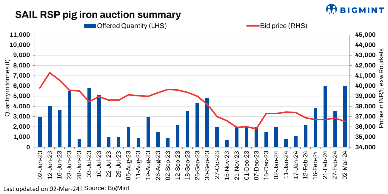 SAIL-Rourkela Steel Plant held an auction for 6,000 t of steel grade pig iron on 2 March’24. 4,800 t quantity was booked at an average price of INR 36,550/t exw. The last auction was conducted on 3,500 t of steel grade pig iron on 27 Feb’24 in which the entire quantity of 3,500 t was booked at an average price of INR 36,850/t exw.