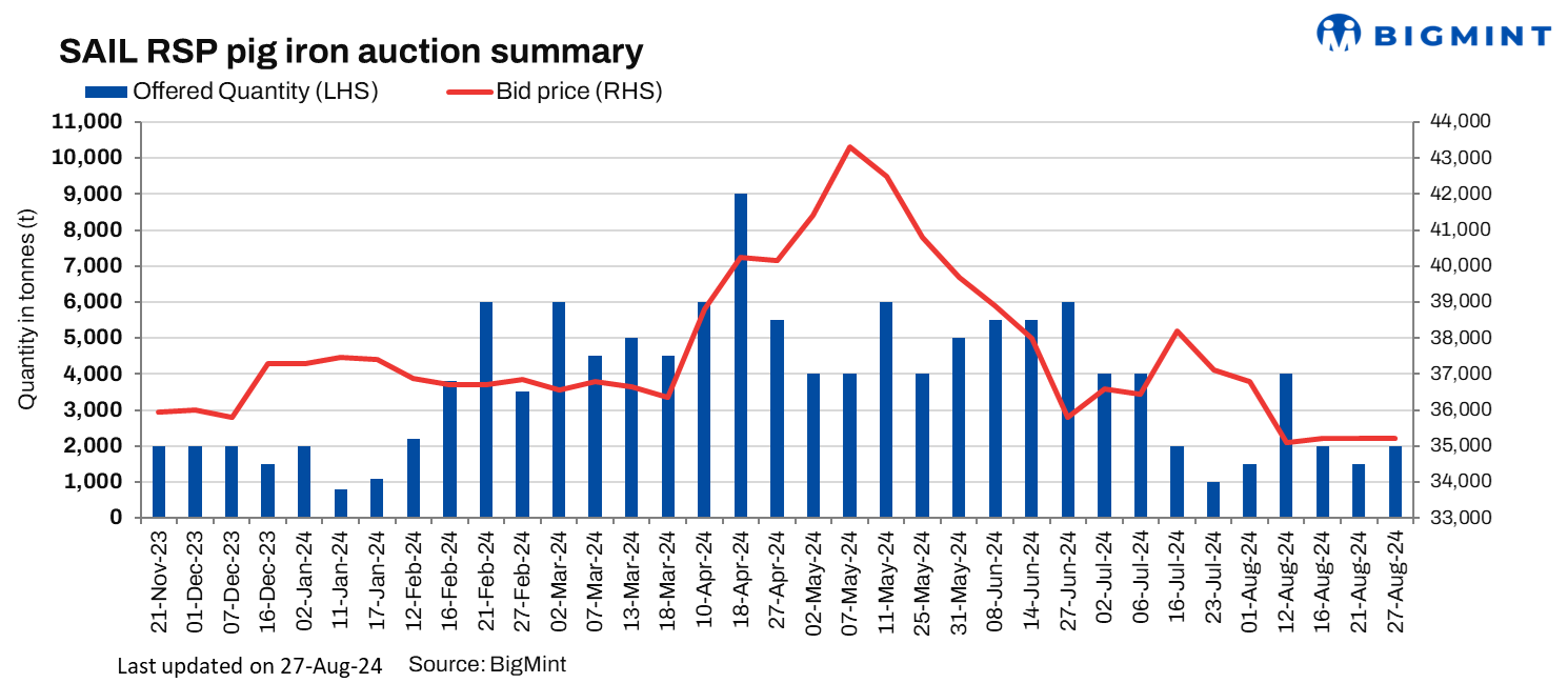 SAIL-Rourkela Steel Plant (RSP) conducted an auction on 27 Aug’24, offering 2,000 t of steel-grade pig iron. The entire quantity was sold at an average price of INR 35,200/t exw. Earlier, on 21 Aug’24, RSP auctioned 1,500 t of steel-grade pig iron, which were fully booked at an average price of INR 35,200/t exw.