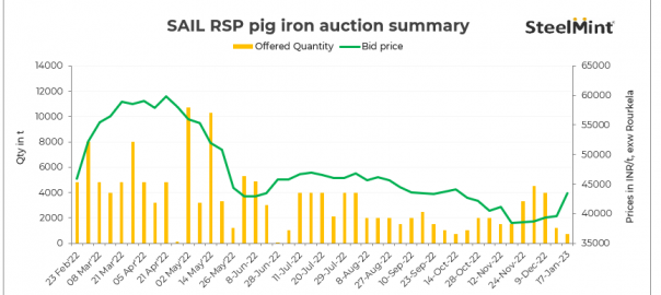 - SAIL-Rourkela Steel Plant (RSP) held an auction for 700 t of steel grade pig iron on 17 Jan’23. The entire quantity was booked in the range of INR 43,400-43,500/t exw.