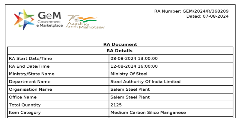 SAIL-Salem Steel Plant (SSP) concluded a reverse auction for 2,125 t of medium-carbon (MC) silico manganese (Mn:55% min, C: 0.5% max, 10-70 mm) on 12 Aug’24. The entire material was booked at around INR 84,900/t FOR (without GST and GEM portal charges), sources informed.